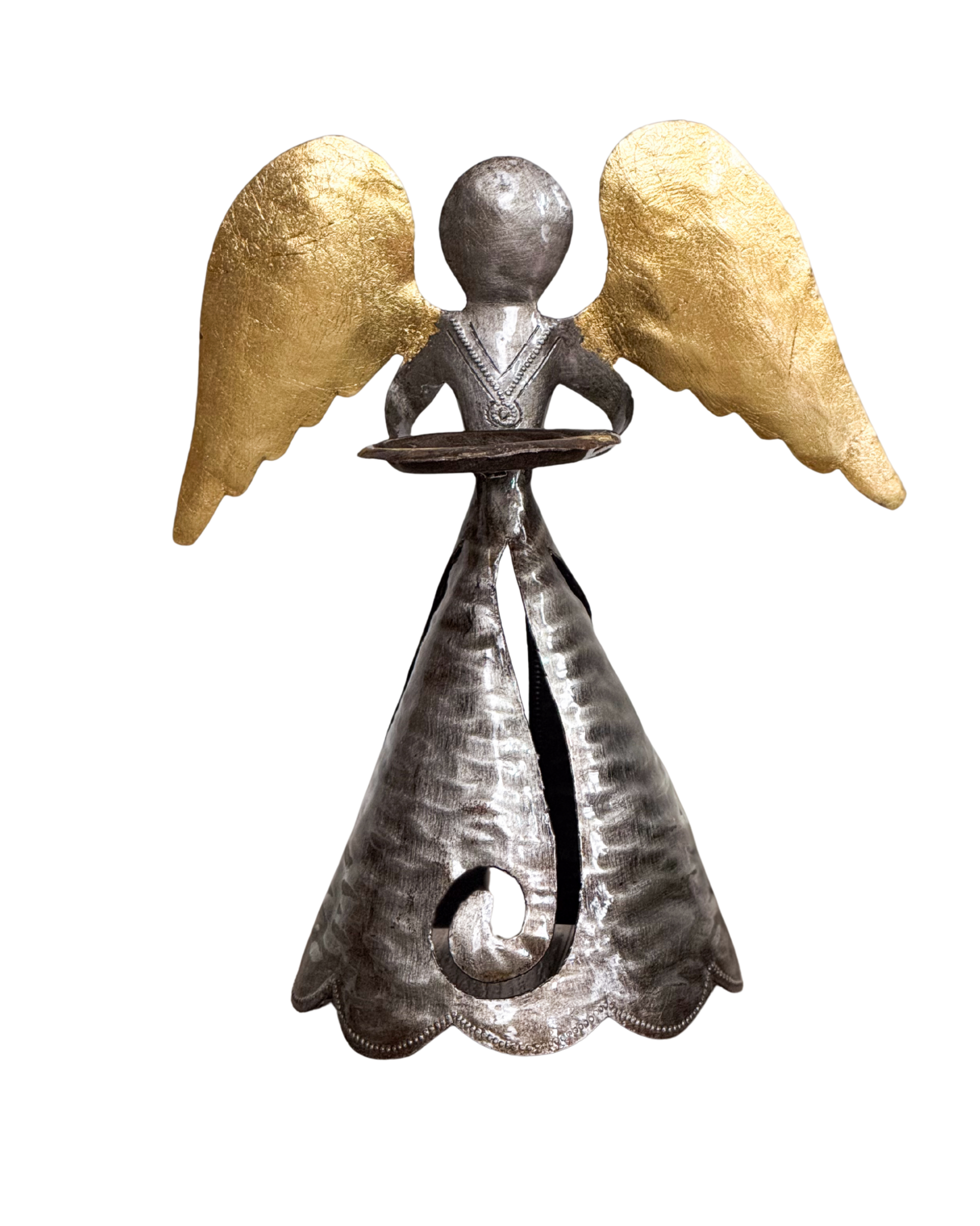 Ange Veilleur, known as the Guardian Angel, is an artistic angel sculpture designed to hold a tray perfect for a tea light or small keepsake. Made from a recycled steel oil drum, this piece combines craftsmanship with eco-conscious design.