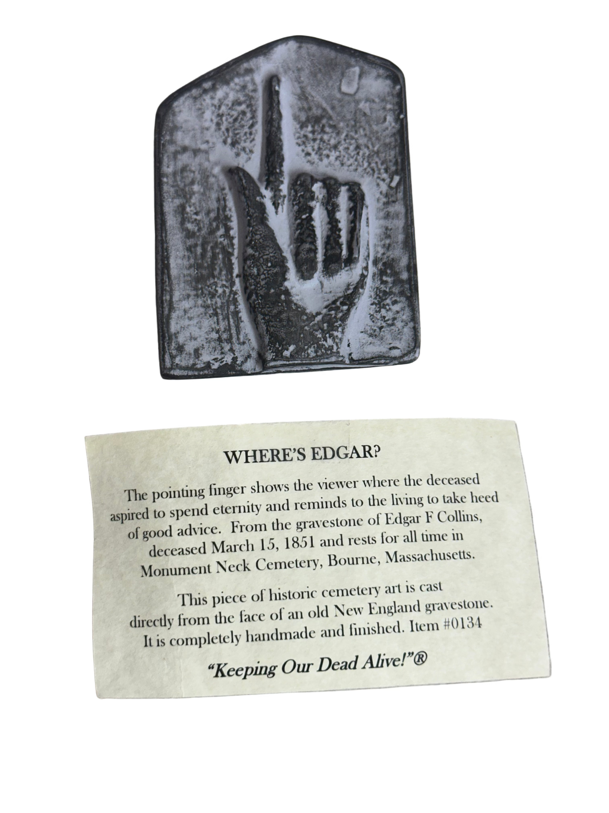 The pointing finger shows the viewer where the deceased aspired to spend eternity and reminds to the living to take heed of good advice. From the gravestone of Edgar F Collins, deceased March 15, 1851 and rests for all time in Monument Neck Cemetery, Bourne, Massachusetts.