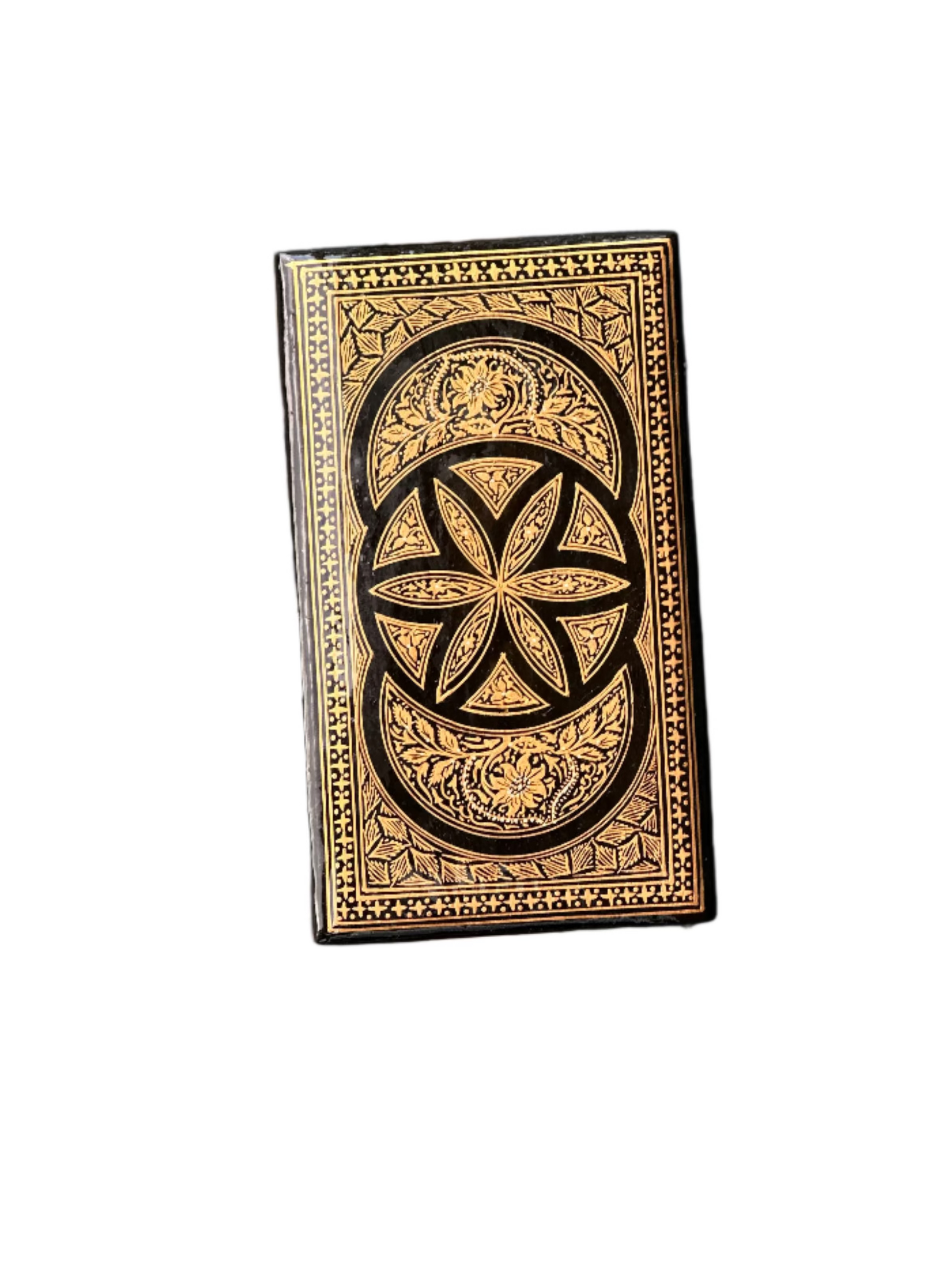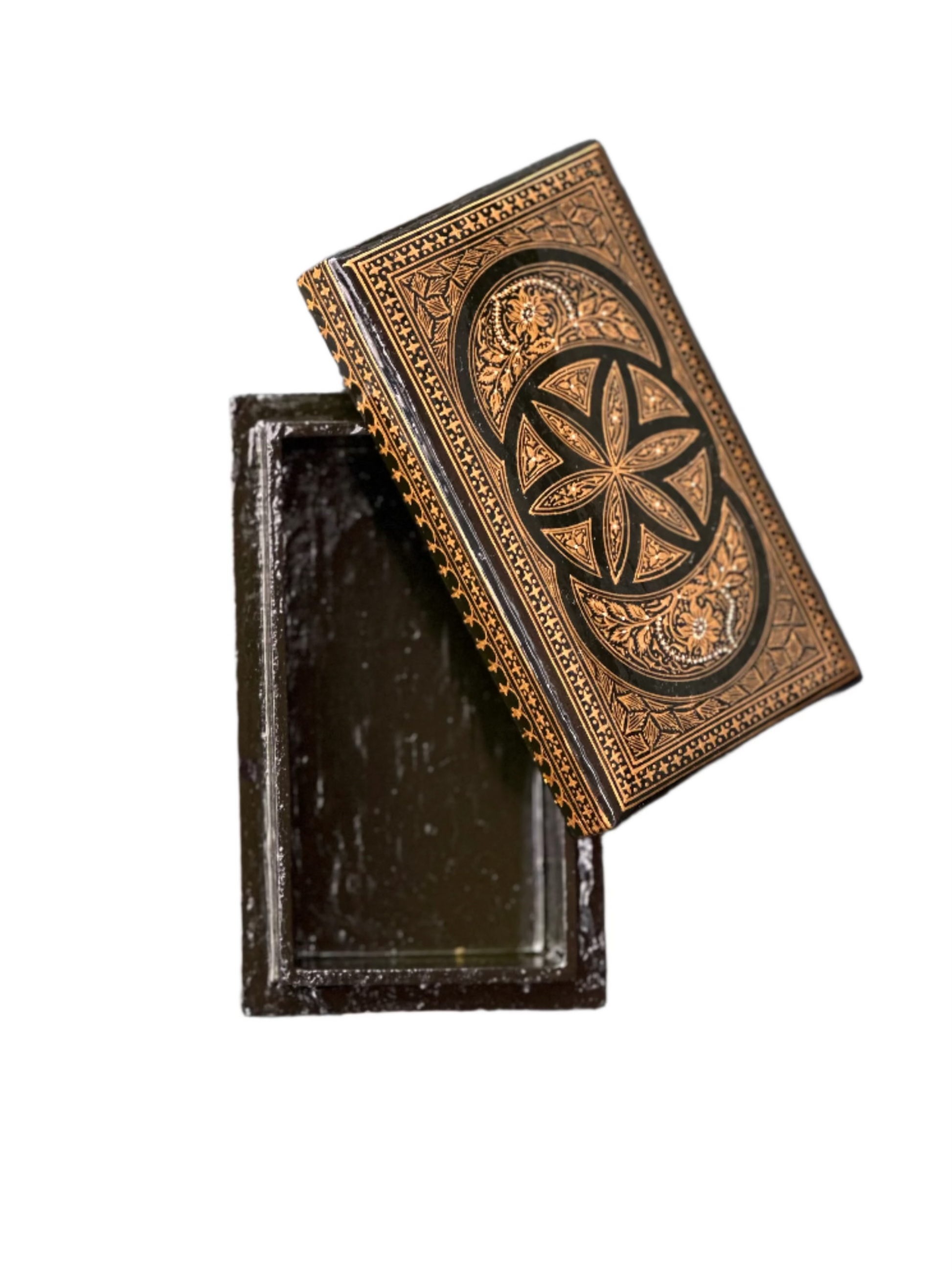 The Fine Line Papier Maché Box originates from Kashmir, India, where expert artisans employ traditional papier-mâché techniques. Multiple layers of paper pulp are carefully molded and dried to form a sturdy yet lightweight base. Skilled hands then apply delicate gold paint by hand, creating fine lines that accentuate the box’s elegant design. This combination of time-honored craftsmanship and precise hand-painting results in a refined, luxurious piece that reflects the rich artistic heritage of the region.