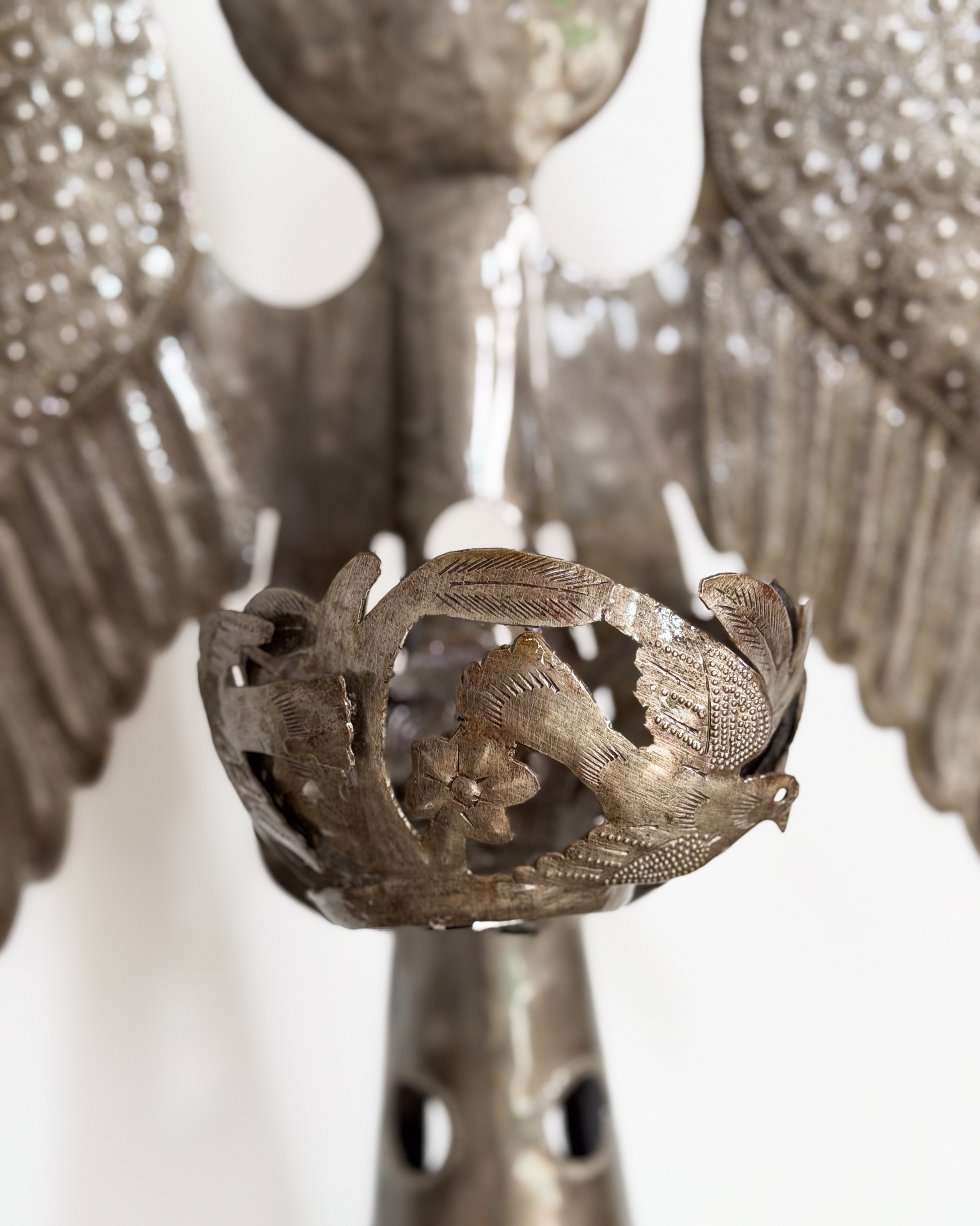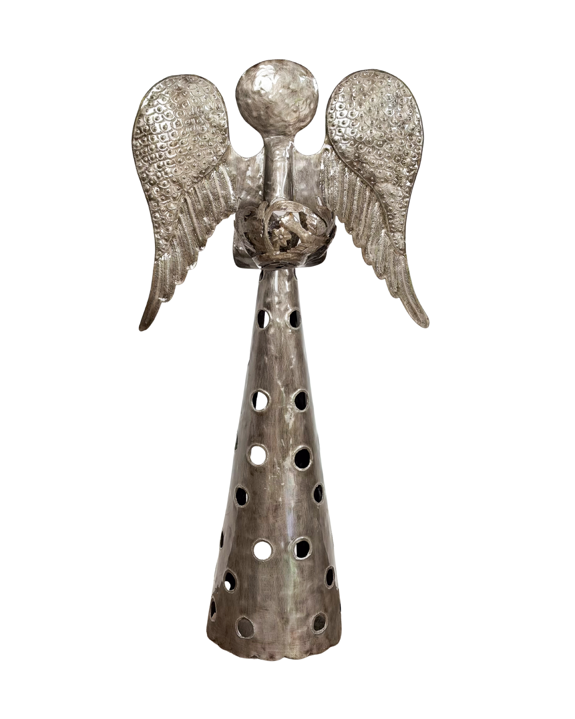 Ange de Lumière, or Angel of Light, is a sculptural piece designed to hold a large candle in her decorative bowl. Crafted from a recycled steel oil drum, she embodies both artistry and sustainability.
