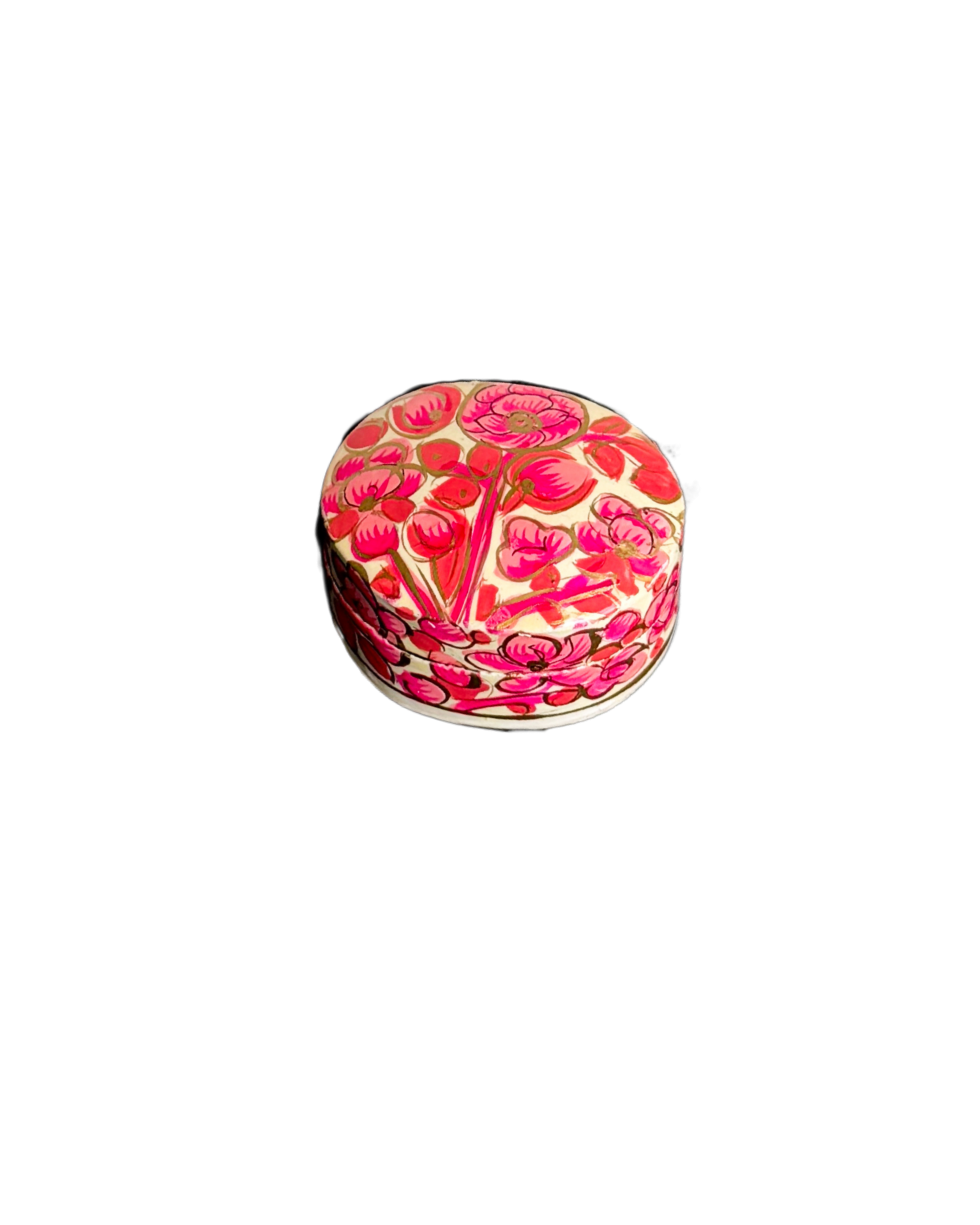 This Papier-Mâché trinket dish from Kashmir, India, is hand-painted in bold, vibrant colors that brighten any room. Ideal for holding small items and cherished keepsakes, particularly rings, this compact box measures approximately 2.5 by 2 inches.